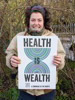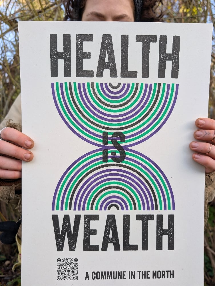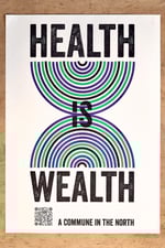 Risograph print of ACitN's 'Health is Wealth' poster, printed on beautiful 225gsm Context Birch paper. This poster features a fun QR code, follow and enjoy. All proceeds help towards building a radical, egalitarian, anti-oppressive, eco-commune for up to 200 peaple in the north of England.