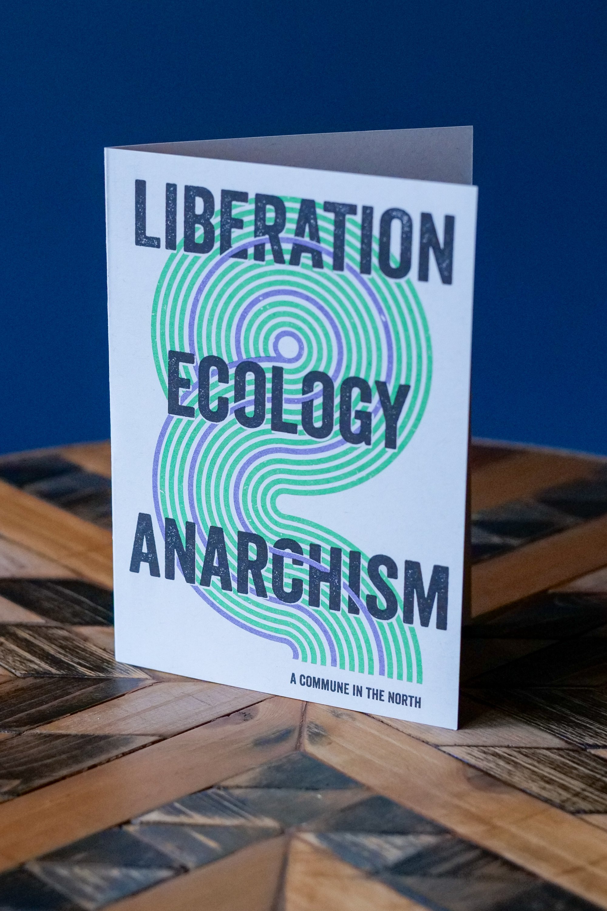 A greetings card version of our 'Liberation, Ecology, Anarchism' poster printed on 100% recycled paper. Each card comes with a free envelope.
