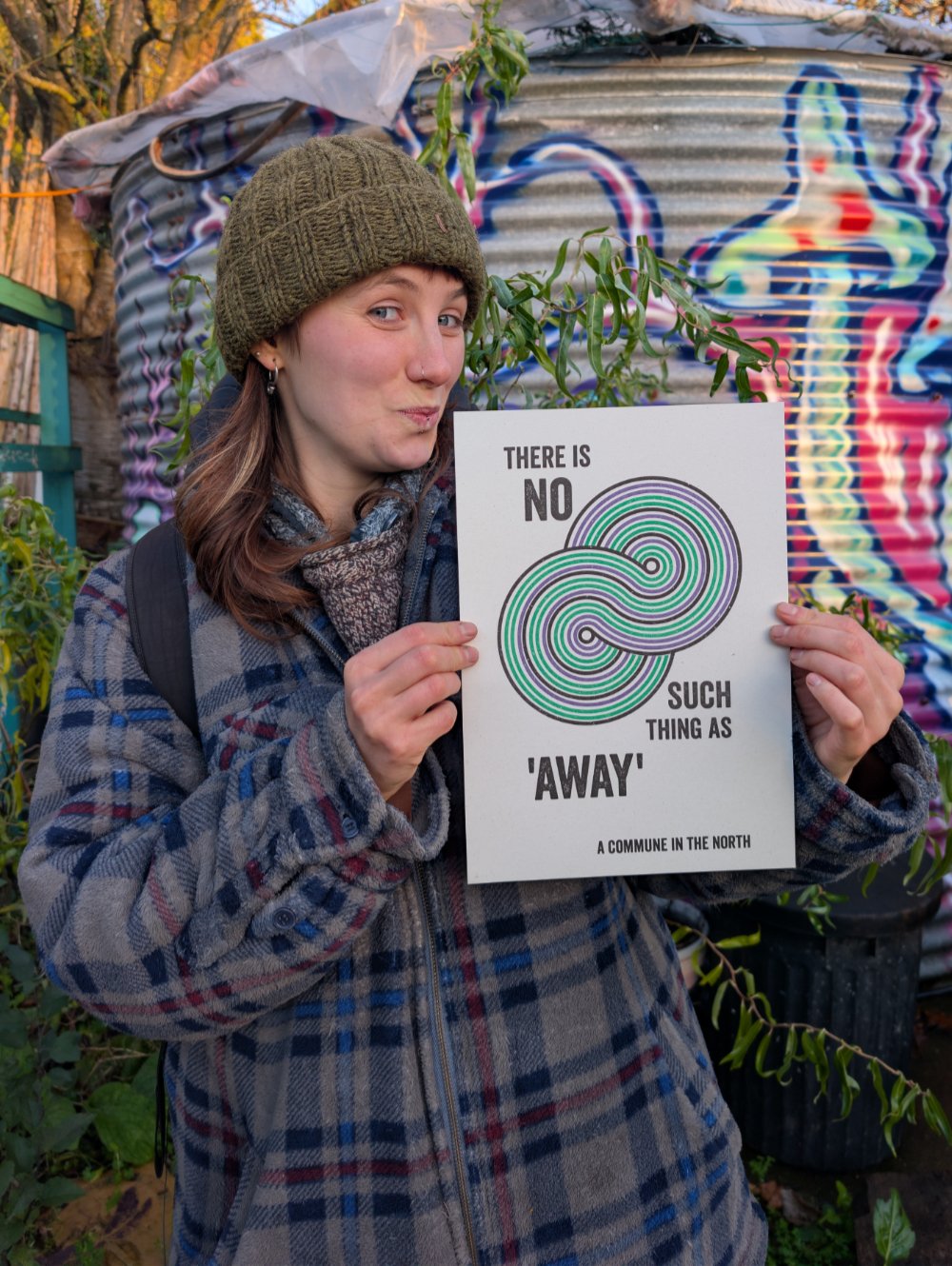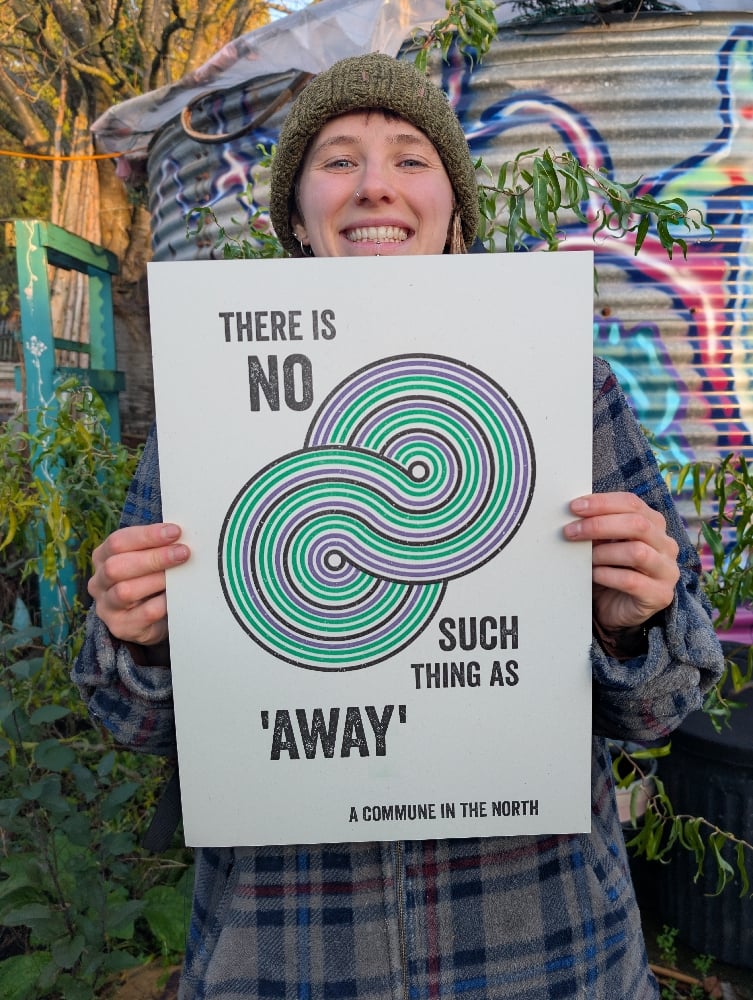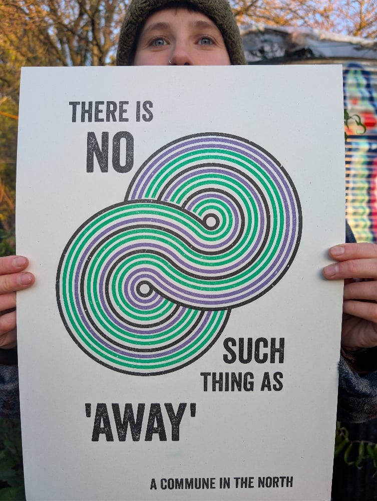 Risograph print of ACitN's 'There's No Such Thing As Away' poster, printed on beautiful 225gsm Context Birch paper. When we talk about 'The Is No Such Thing As Away' we're refering to the fact that simply moving a problem from sight, whether it be waste, pollution or people, does not solve the problem. There is no away on a finite planet. All proceeds help towards building a radical, egalitarian, anti-oppressive, eco-commune for up to 200 peaple in the north of England.